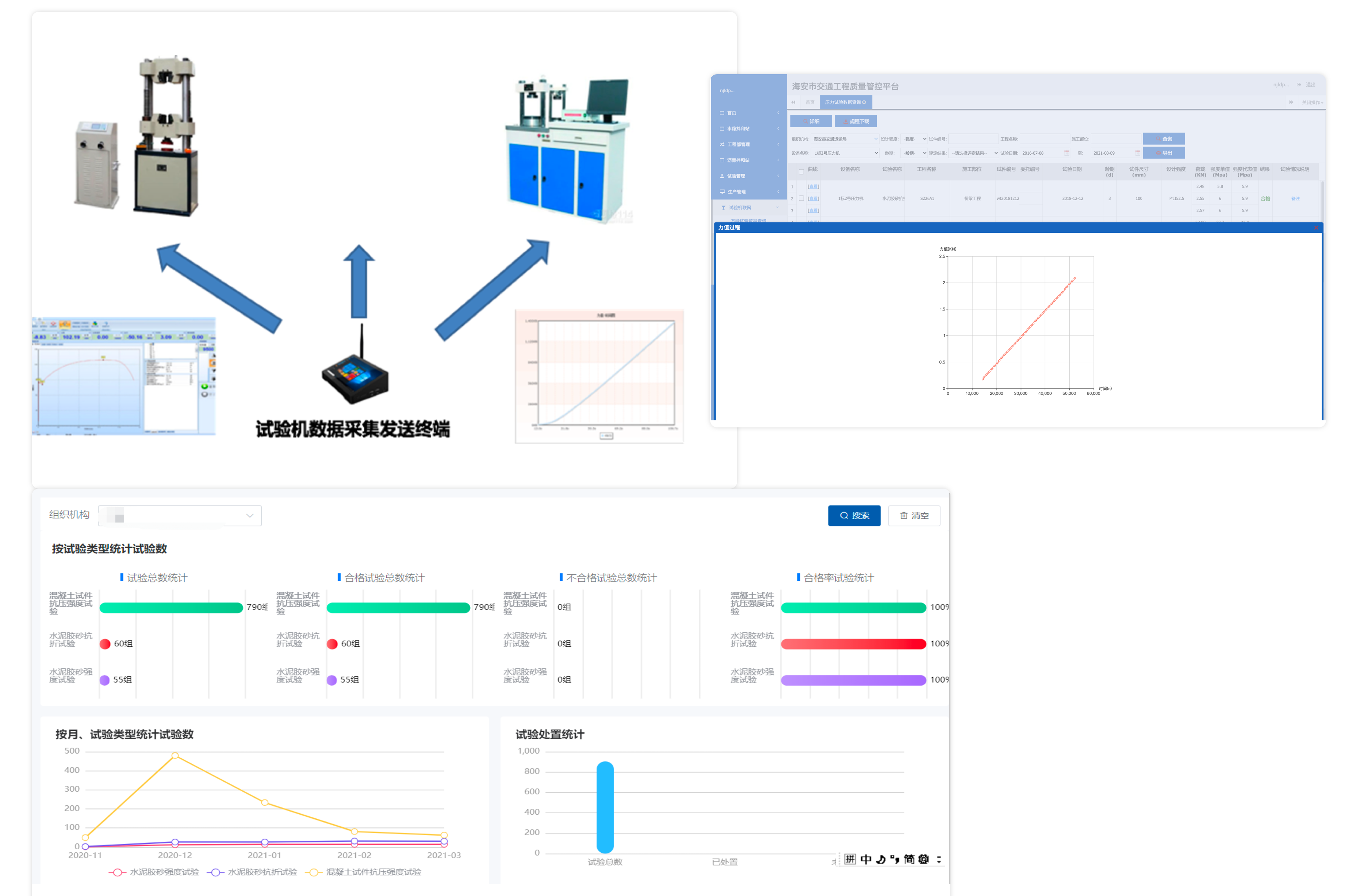 在試驗機安裝智能數(shù)據(jù)采集終端,全自動化采集試驗機的試驗數(shù)據(jù),按照規(guī)范要求進行匯總、統(tǒng)計分析,管理人員可以及時的